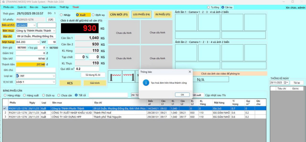 - Ngay sau khi phiếu cân được lưu, hệ thổng thiển thị thông báo “Tạo hóa đơn trên Misa thành công” cho phép người dùng tạo hóa đơn VAT trên MISA chỉ bằng một thao tác “Lưu phiếu”