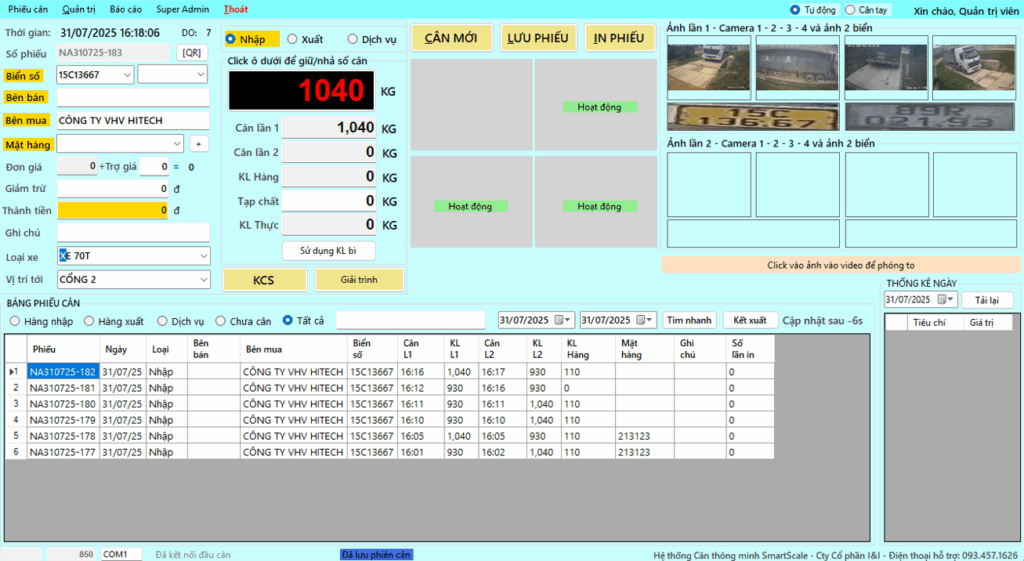 • Liên kết các phân hệ khác: Tích hợp với báo cáo, thống kê, quản lý phương tiện, cảnh báo lệch bì, phân tích dữ liệu cân, nhận diện biển số xe bằng AI… tạo nên hệ sinh thái quản lý trạm cân toàn diện.